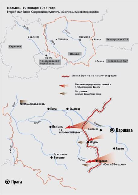 19 января 1945 года советские части вошли в Краков. Бои носили локальный характер: основные силы вермахта отступили, не сумев осуществить замыслы по превращению города в руины.