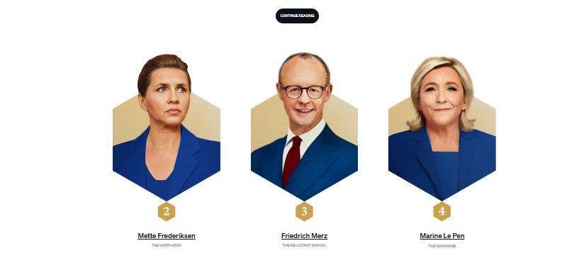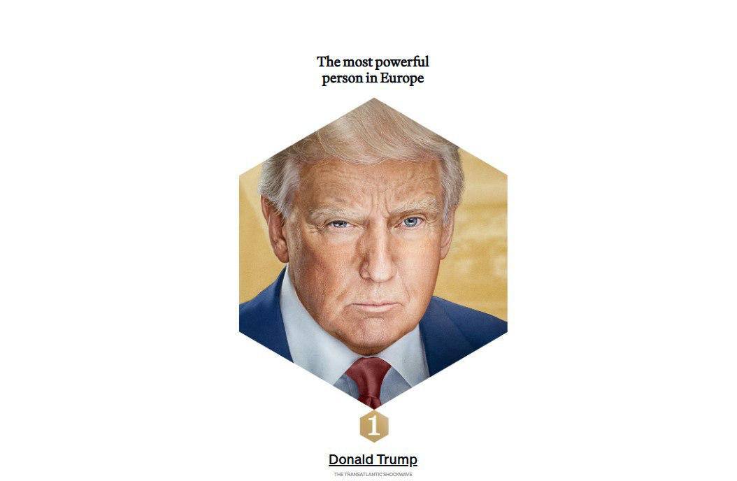 На первом месте — Дональд Трамп. Несмотря на то что он не европеец, его назвали «трансатлантической ударной волной». По версии издания, отношения Европы с Трампом — «сплошное дипломатическое упражнение»: иногда он партнёр, иногда угроза, но всегда — сила, меняющая правила игры.